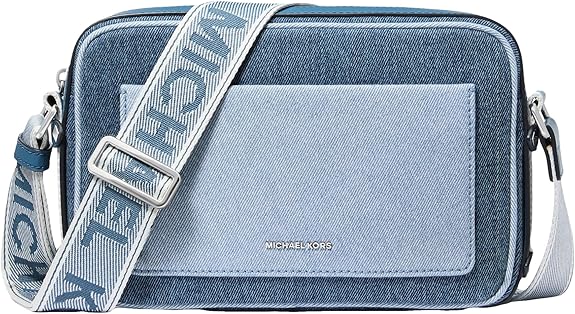 • Materials: Made from two-tone cotton denim with smooth trim and silver-tone hardware Attention to Details: Exterior back and front slip pockets, interior back slip pocket, zip fastening and polyester lining. 10.75″W X 6.75″H X 4.25″D with a 12.75″-26.75″ adjustable crossbody strap